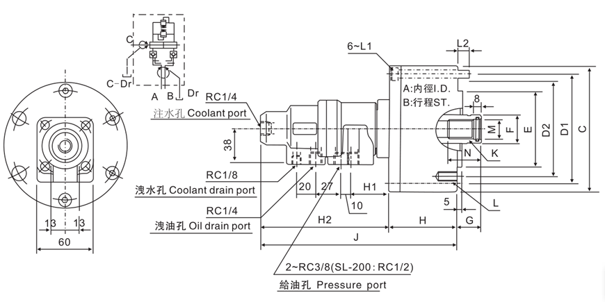 高转速注水型回转油压缸,可通过油压缸后端供应切削液。