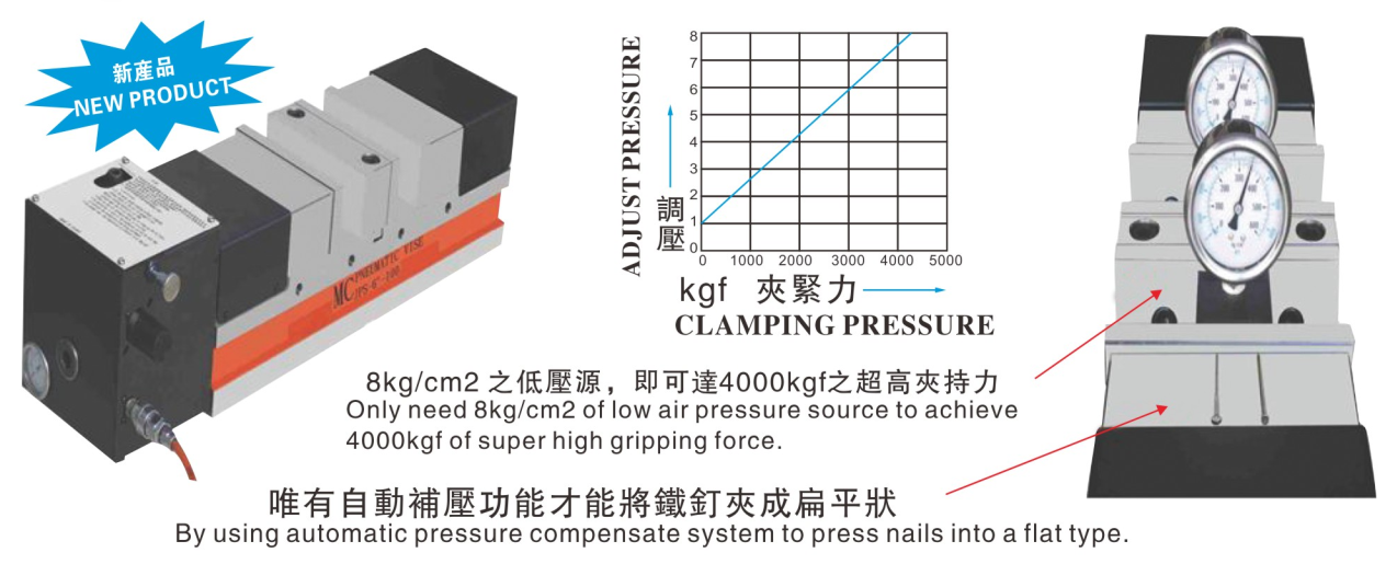 空压源8kg/cm2 之低压源,即可达4000kgf之超高夹持力,而夹持力从0-4000kgf可借由调压器自由调整设定。