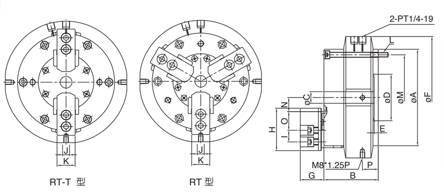 | RT-08 | 14 | 35 | 6-M10×1.5P | PCDØ185 | 28 | 44.92 | 41.52 | 29.55 | 17.55 |