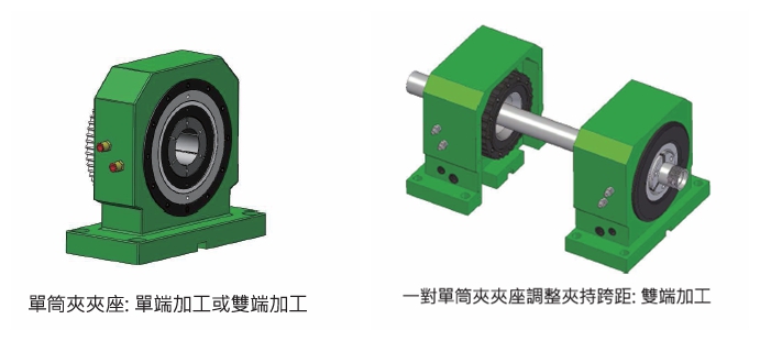 针对追求高生产效率的加工专用机械,提出了全新的夹具设计观念。传统的自动化工件夹持系统是由一系列的标准化组件所组成,包含了回转主轴、动力夹头、及液气压驱动系统。JAW/JHM空油压主轴夹座将三者整合为一。大幅提升加工专用机械的设计弹性生产效率。应用主轴夹座,专用机械能大量缩短工件送料行程与装夹的时间。此外,由于主轴夹座的外型短薄,短型工件能在一次的装夹作业完成工件双端同时加工,而长型工件能以一对单筒夹主轴夹座在一次的装夹完成工件双端同时加工。目前设计有一系列的筒夹主轴夹座,能适应多种加工件。