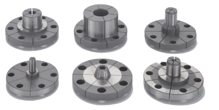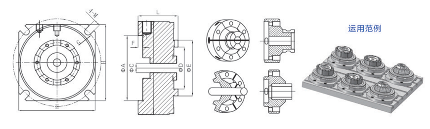 Fixed, non-rotating, directly driven by the built-in cylinder Employing diaphragm elasticitytechnology, with a repeatability of below 3uPermanent service life in precision; designed with high sealing performance and waterproofand dustproof capabilitiesAllowing easy control over the concentricity and parallelism at both ends Allowing separatesize processing over multiple sections to reduce equipment costsReplacing CNC multi-section simultaneous processing with single-action grinding machineAllowing fine-tunning with three-point clamping forceAPPLICATIONSSuitable for non-standard fixtures for CNC milling and drilling machines; may be used asrow-type multi-station fixtures