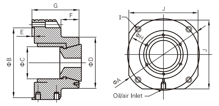 Fixed and non-rotating.Glue-injected flexible collet, parallel clamping, with a largerclamping surface and stronger gripping force.With a long service life, and good waterproof and dustproof capability.Allowing easycontrol over the concentricity and parallelism at both ends.Allowing separate size processing over multiple sections to reduce equipment costs.Replacing CNC multi-section simultaneous processing with single-action grinding machine.Requiring the provision of rear pneumatic/hydraulic cylinder rod drive.Suitable for non-standard fixtures for CNC milling and drilling machines; may be used asrow-type multi-station fixtures.