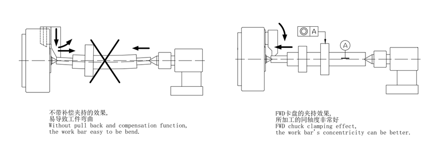 1. It's suitable for shaft machining, the chuck have the function of compensation clamping and pulling back, the compensation size is 5mm.2. The tailstock support the shaft, after compensation clamping, the chuck pull the shaft back to center, better concentricity can be made.