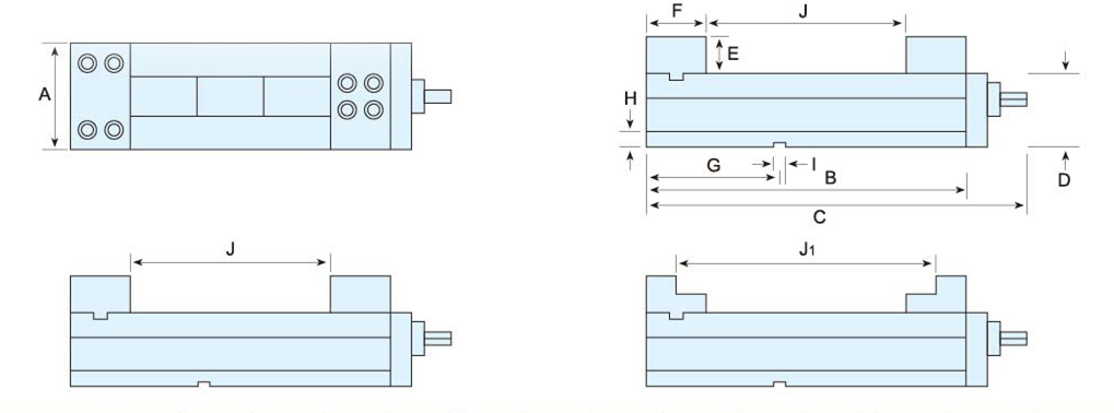 | MODEL | A | B | C | D | E | F | G | H | I | J | J1 | N .W. | G.W. | Clamping force |