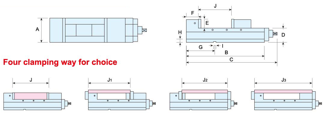 | MODEL | A | B | C | D | E | F | G | H | I | J | J1 | J2 | J3 | N.W | G.W | Clamping force |