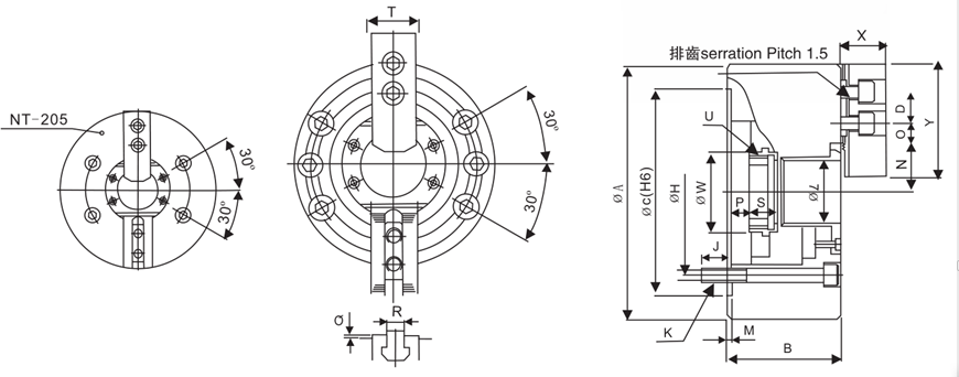 Sliding surfaces, master jaws, and interior parts are hardening and grinding,oil nipple locate in the master jaws,the serration pitch is 10.5mm*60°