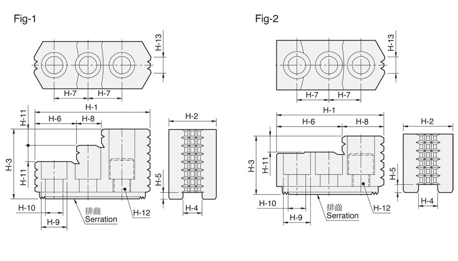 | Model/Size | H-1 | H-2 | H-3 | H-4 | H-5 | H-6 | H-7 | H-8 | H-9 | H-10 | H-11 | H-12 | H-13 | Serration pitch | Illustration | For Chucks |
